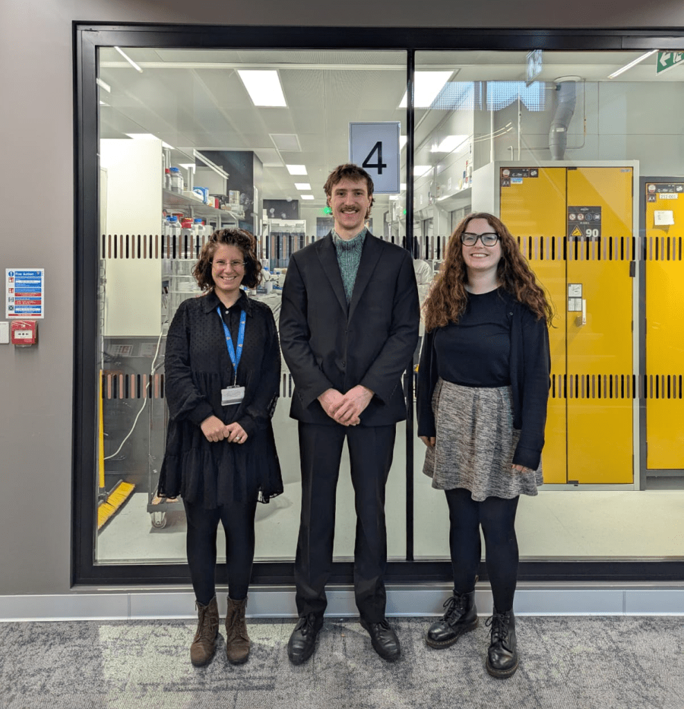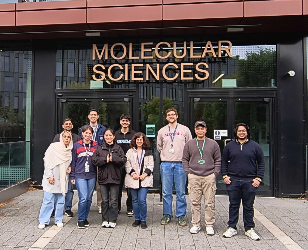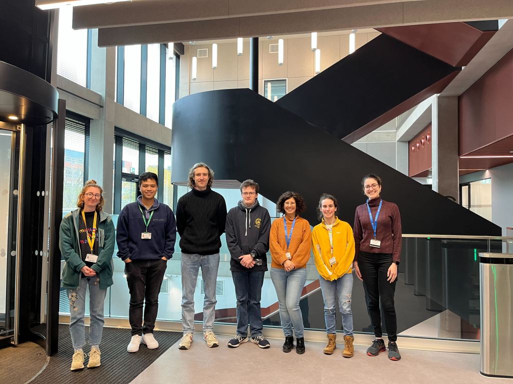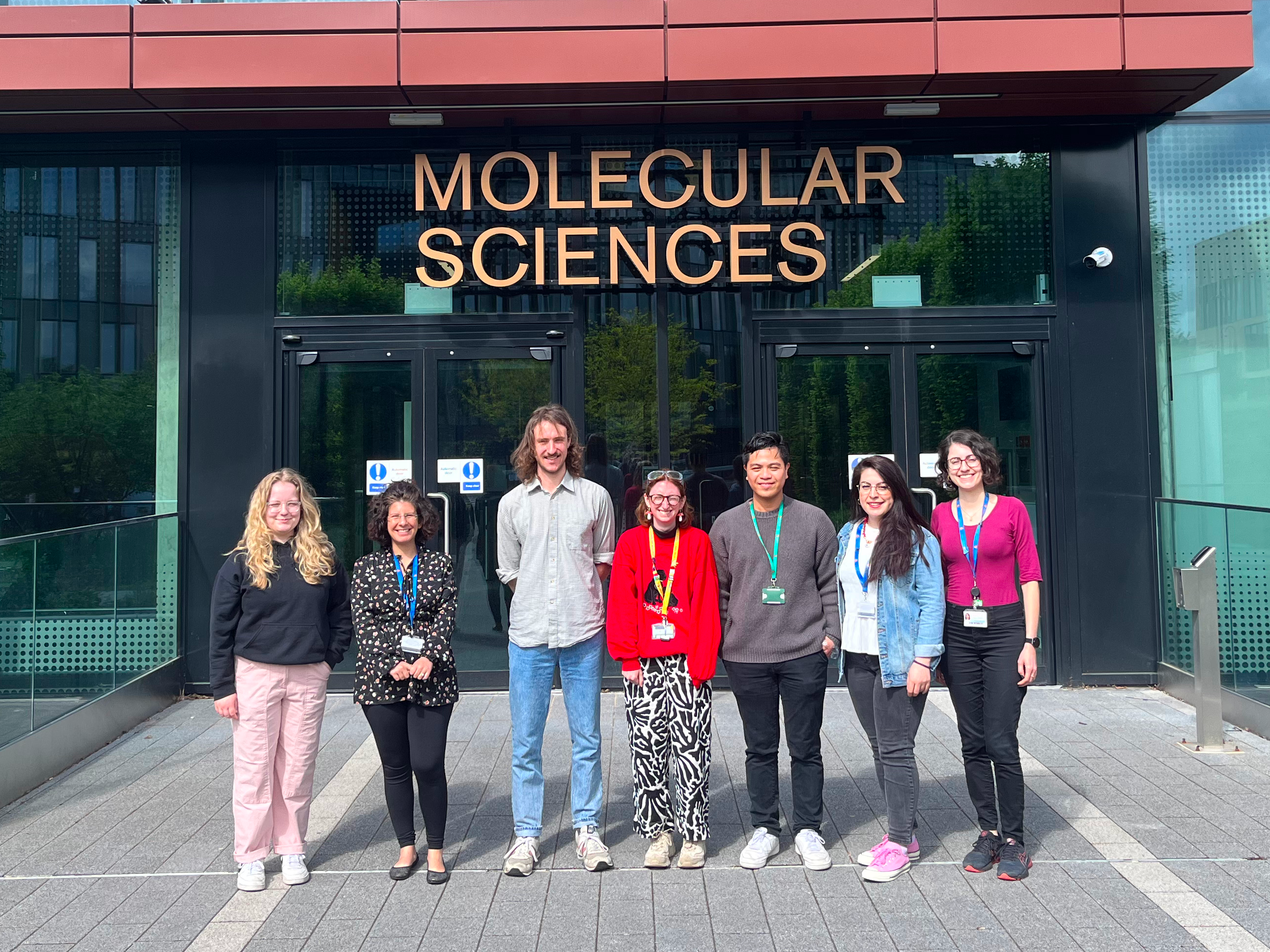 A (growing!) group trip to the new molecular sciences building (MSB) on campus. L to R, Josie Robins, Amaziah Alipio, Alasdair Rigby, Edward Kane, Chiara Arno, Ana Cubillo, and Natalia Reis.