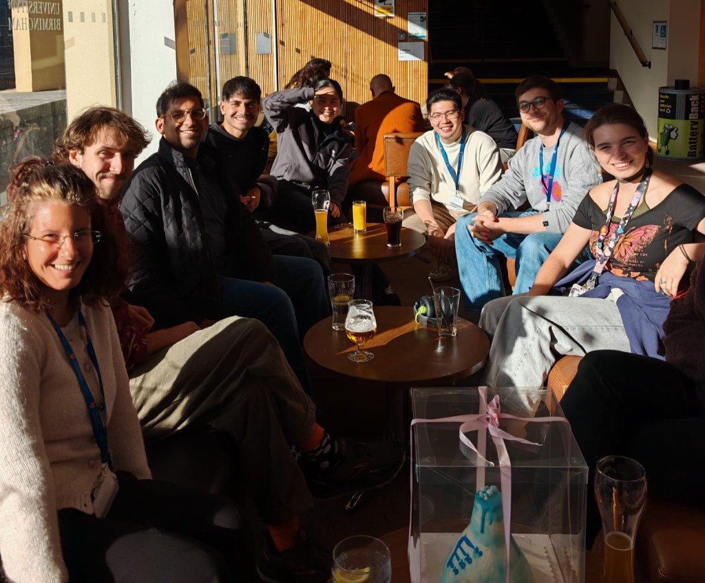 Group trip to Staff House on campus to celebrate Alasdair and Amaziah submitting their PhD theses (on exactly the same day!). L to R, Chiara Arno, Alasdair Rigby, Arsalan Latif, Emre Turan, Hui Zhu, Kaixiang Yang, Josh Tibbetts, Gaia de Domenico.